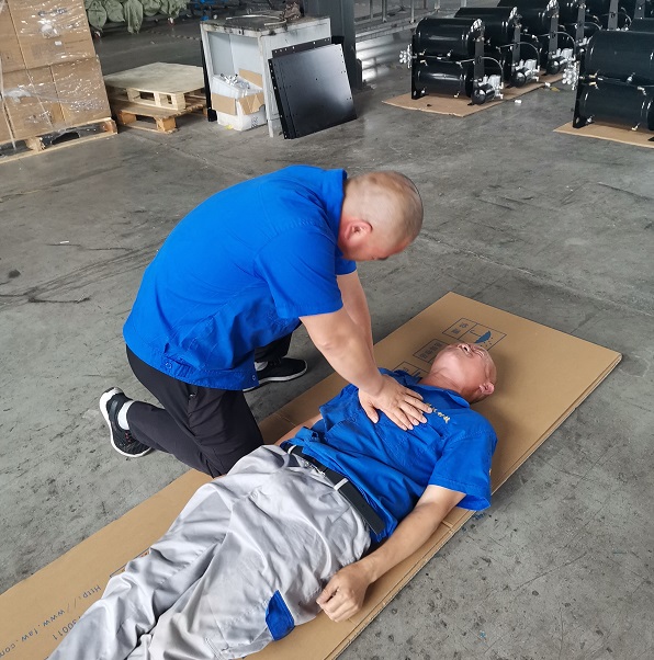 演練模擬一名員工因觸電當(dāng)場昏厥。當(dāng)意外發(fā)生后,同事迅速切斷電源,并立即將觸電人員移至寬敞通風(fēng)處,對其進行心肺復(fù)蘇和人工呼吸等急救措施,同時第一時間撥打醫(yī)院急救電話將傷員送往醫(yī)院。演習(xí)重點檢測了車間員工的處理事故能力,同時在實施救援過程中的分工與職責(zé),以及員工對心肺復(fù)蘇等急救方法的掌握情況。